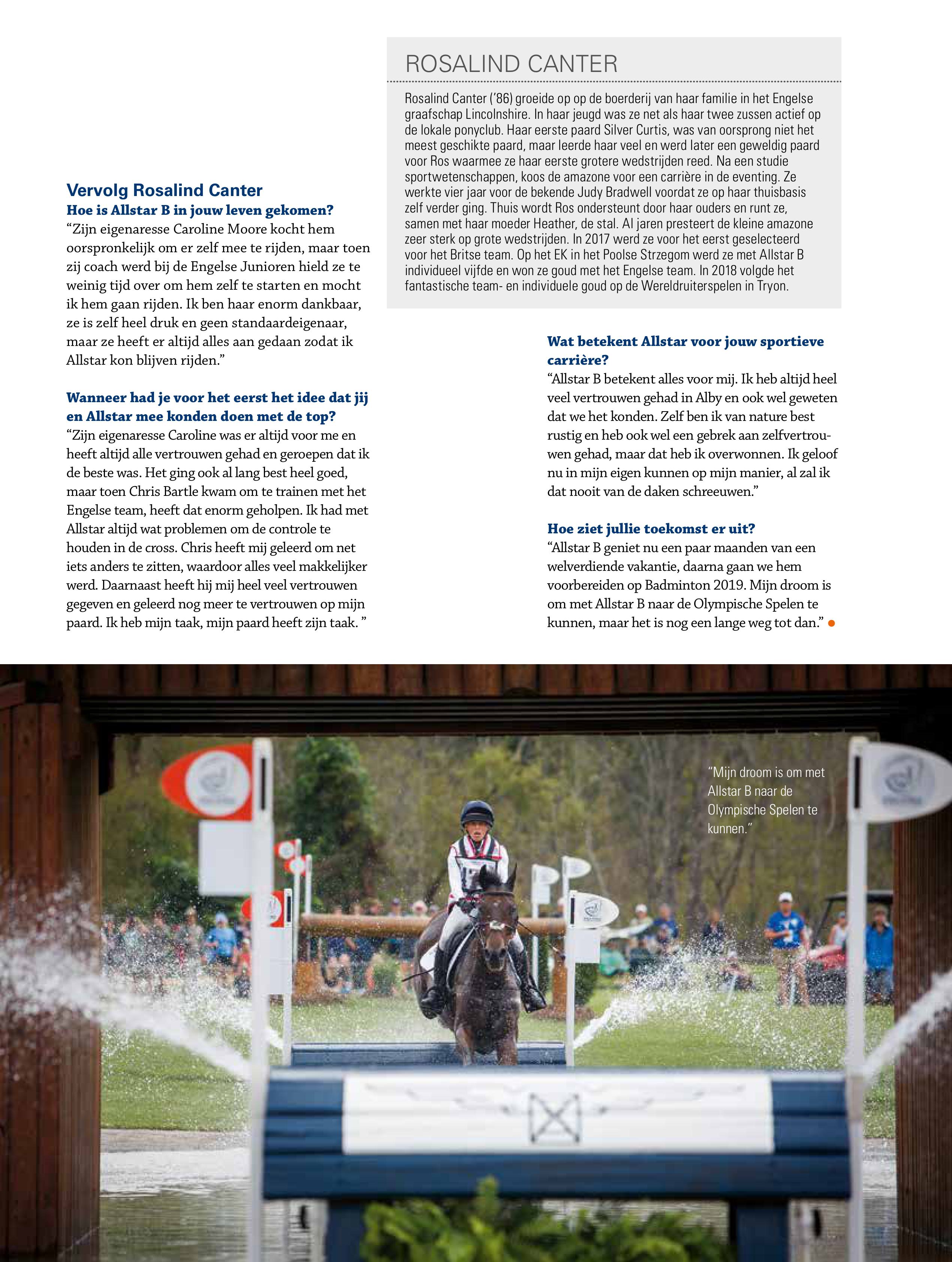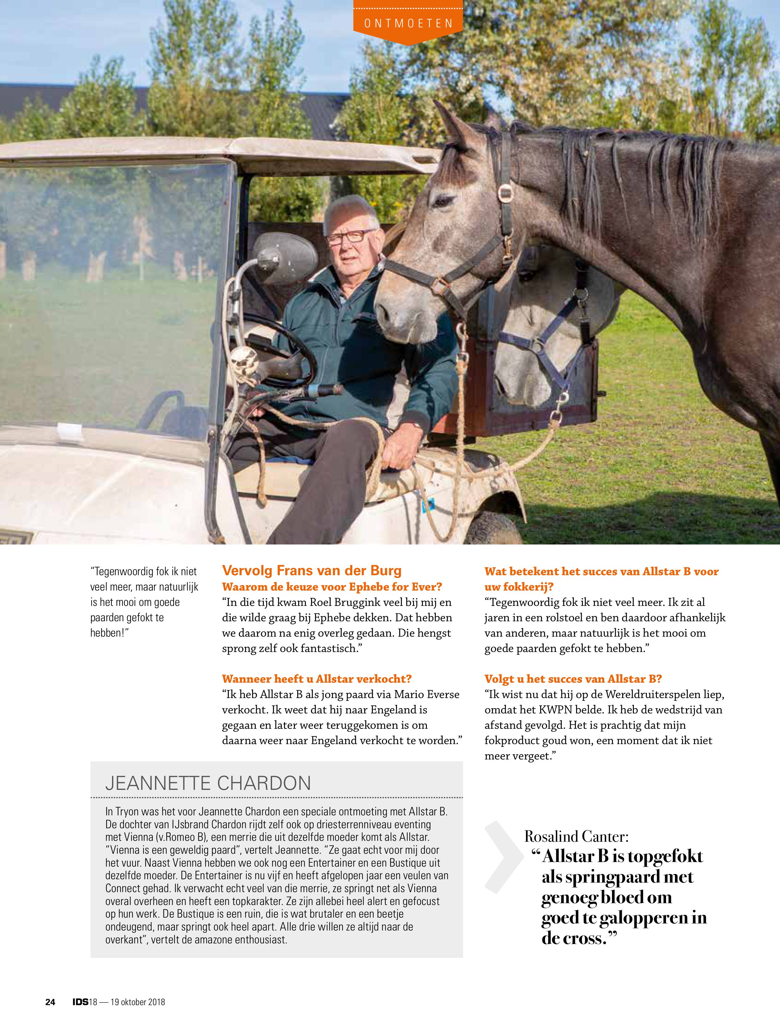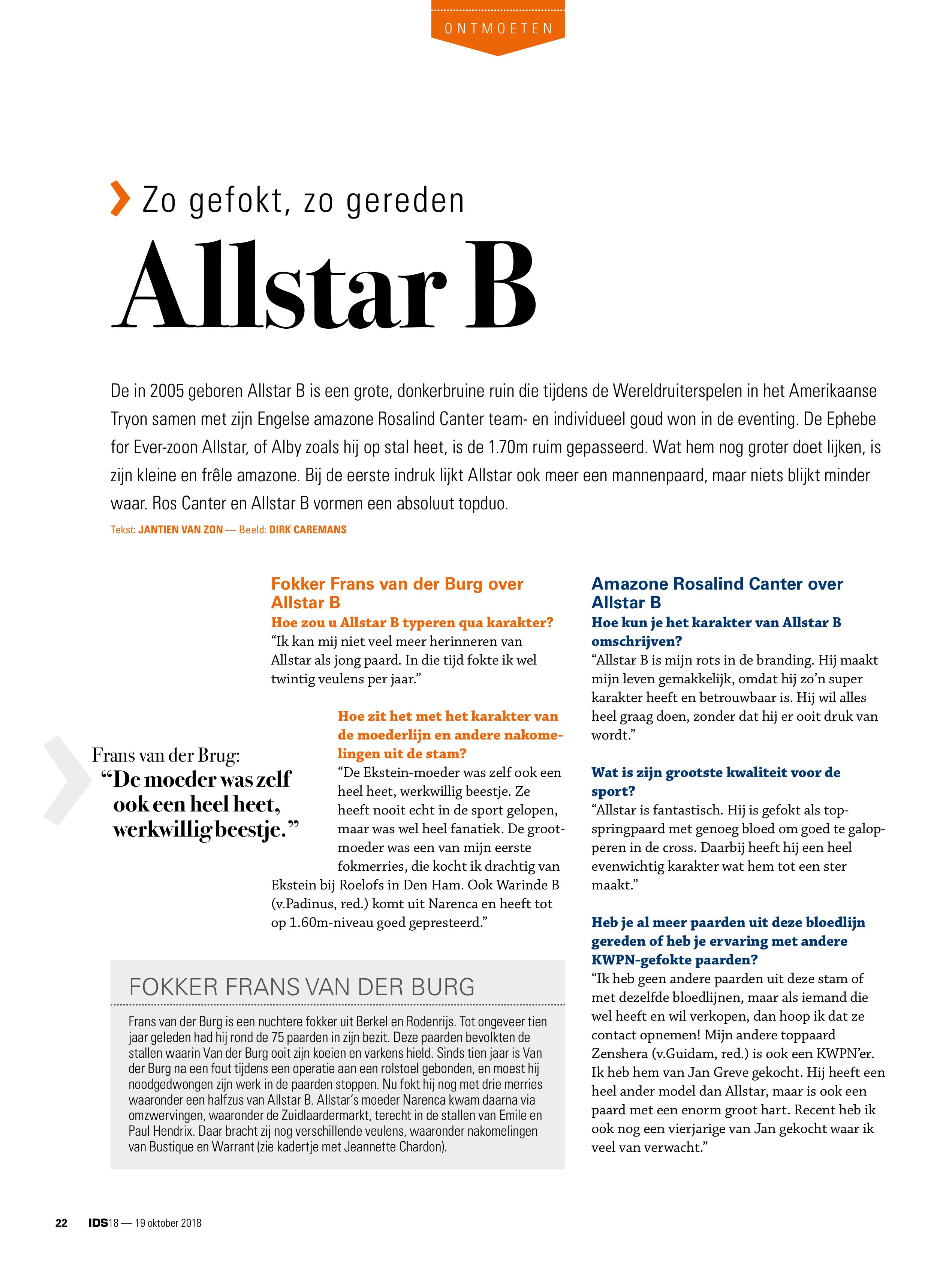 Wereldkampioen Allstar B (V. Ephede For Ever x Ekstein) fokker F.A.J. van der Burg uit Berkel en Rodenrijs won met Rosalind Canter individueel en team goud op de Wereldruiter spelen in Tryon. De combinatie werd in 2018 derde in de zware CCI4* wedstrijd in Badminton, in 2017 werden ze vijfde in Badminton, ze waren in het Poolse Strzegom lid van het Europees Goud winnende Engelse team en vijfde in het individuele klassement op het EK.